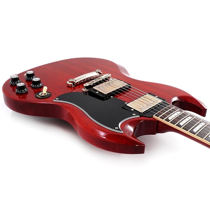 61年スタイルのスモールピックガードがSGファンの心をくすぐる1本。SGの特徴と言えば、薄いソリッド・マホガニー・ダブルカッタウェイ・ボディとスリムテーパーに仕上られたネックシェイプですね。軽量かつハイポジションでもスムーズなフィンガリングが可能となっており、高いプレイアビリティを誇ります。