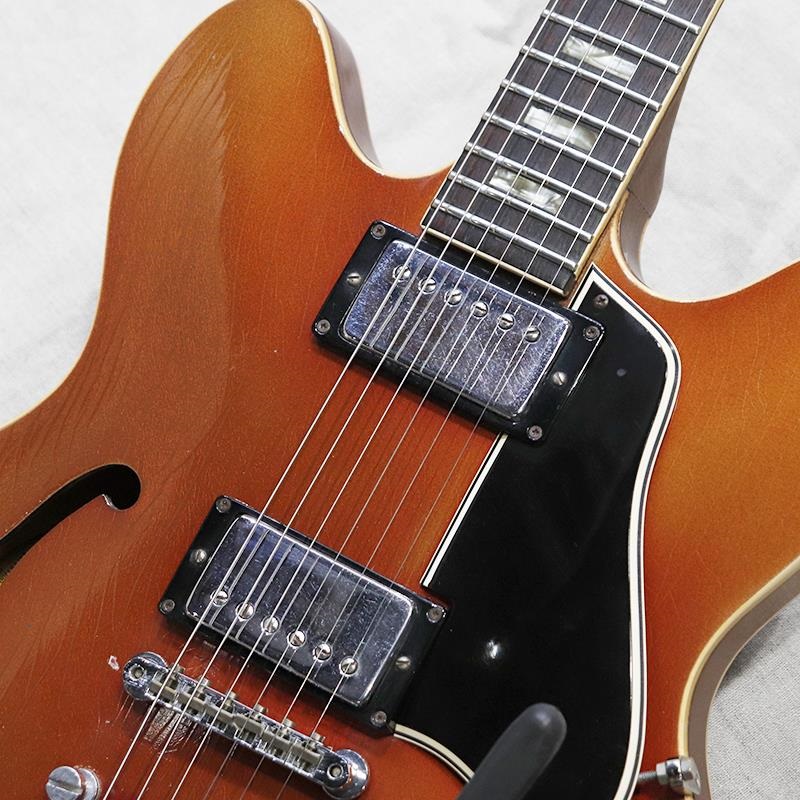 全体重量は約3.7kg。ボディ材はメイプル、センターブロックを備えた約16インチほどの幅を持つセミホロー構造はおなじみ。レアなスパークルバーガンディカラーが褪色し、メタリックなオレンジに渋く仕上がっております。全体的にウェザーチェック、打痕等キズ部分、金属パーツのくすみはみられるものの、塗装の艶自体は良好で比較的きれいなコンディションをキープしております。オリジナルのブランコテールピースからビグスビーB-6トレモロユニットにコンバートされているのが注目ポイントでしょう。その他アウトプットジャックが交換されています。