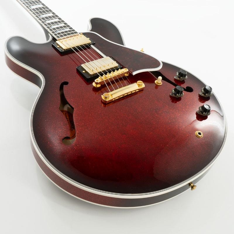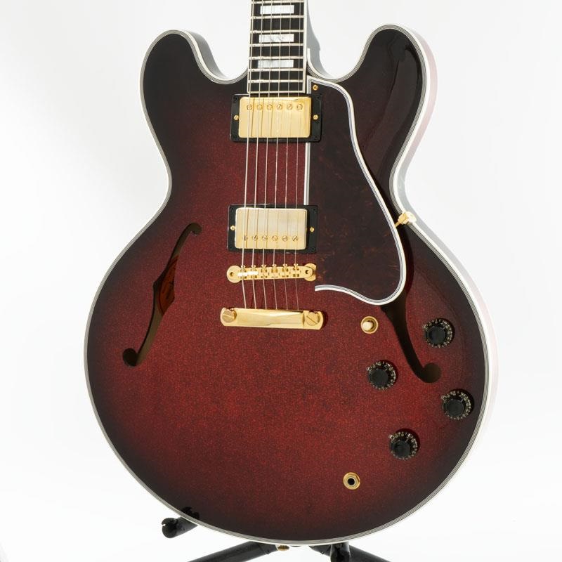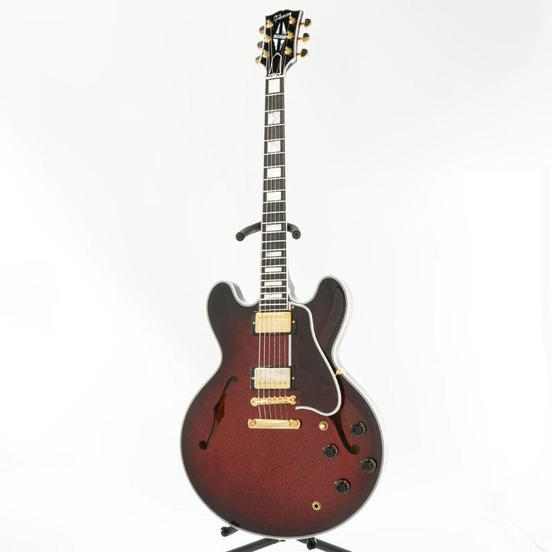 「ES」シリーズもギブソン・ソリッド・シリーズの流れを組むラインナップ構成がされており、当機はLes Paulで言うところのアップグレード・モデル「カスタム」的な位置付けがされ、「カスタム」特有のスペックを採用している点が特徴となっております。スプリット・ダイアモンド・インレイが施されたラージマルチ・プライ・セル・バインディング、ゴールドパーツの採用等、上位機種らしい豪華さを兼ね備えており、レギュラーESシリーズに比べても圧倒的に重厚な高級感を醸し出しております。