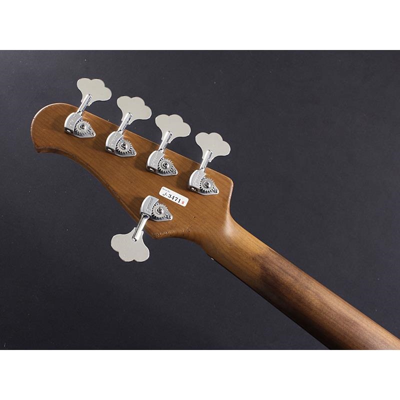 本機はアルダーボディ、メイプルネック&ローズ指板で仕上がるトラッドな60年代JBベーススタイルの5弦仕様。ネックにはオプション項目のローステッドメイプルが使用されており、手にした瞬間から程よくこなれたアタック感、濁りなく粒立ち良い音像を得ています。また、塗装も伝統的なラッカー仕上げが採用されており、エイジング加工が施された外観さながら、既に弾き込んだかのような、まとまり良い音像、芳醇な倍音感も備えた風格あるサウンドに仕上がっています。濃厚でファットなアルダー特有のローミッド感や艶やかなハイミッド感によるリッチなトーンが心地よく、ローB弦までバランスよい発音を得ています。また、本機ではピックアップもオプションスペックが採用されており、「Raw Vintage Pick Ups」が搭載されています。ハンドワイヤリング・ピックアップならではの瑞々しい粒立ち、暖かみのあるトーンを創出しており、パッシブ使用時にもリッチなサウンドを奏でています。