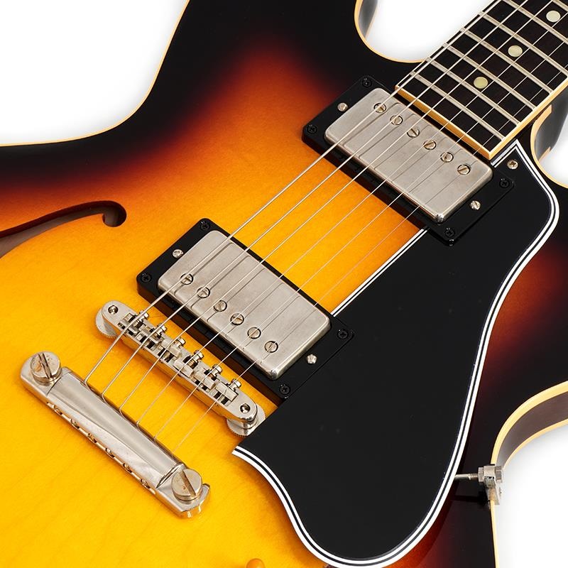 2021年製となる本機はネックやフィンガーボードのハイドグルーフィットや、チューブレストラスロッドももちろん採用されています。ソリッドセンターブロックはライトウェイトな材が使用されているように感じられ、本機も重量およそ3.7kgと抱えやすい程好いウェイトで、構えた際のバランスも良く、そしてセミアコースティックギターのホロウ感をより自然に引き出しているように感じられます。