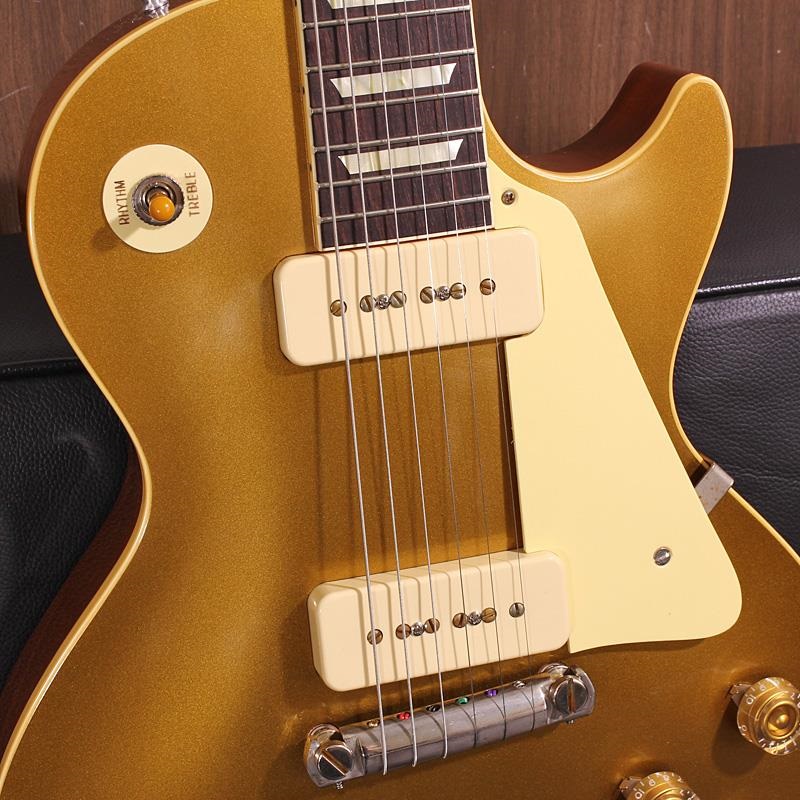 Goldの色味はDouble Goldと名づけられたカラーがフィニッシュされており、見る角度、光の当たり具合によって、渋さのある深緑から、明るいグリーン系のゴールドの色合いまで変化が楽しめます。P90ピックアップはフルサイズのハムバッカーよりもすっきりとしたシルエットになりますのでボディのトップカーブをより一層艶かしく見せてくれます。勿論、ハードウェアーやプラスチックのパーツ類は他モデル同様にTrue Historicパーツが採用されておりますのでオールドテイストの魅力を引き立てています。