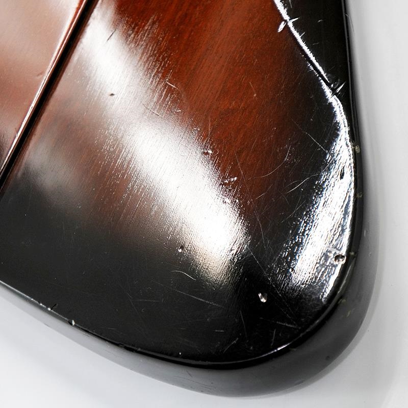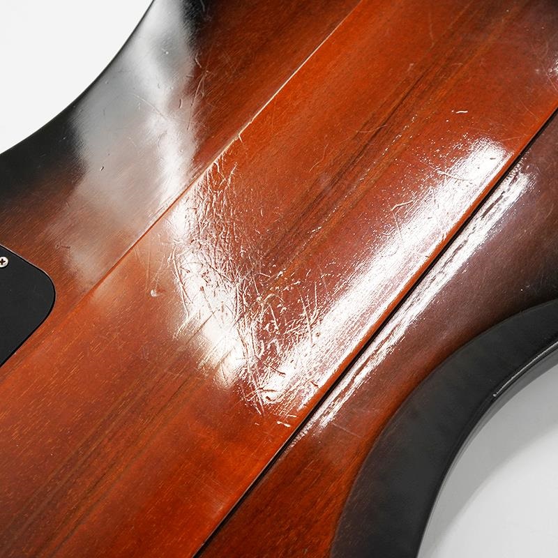 細かい傷や、ボディトップ右の真ん中角部分の木部の見える大きめの打痕を初めの細かい無数の打痕、バックル傷、全体の塗装焼け、ピックガード上部のクラック、ピックガードの弾き傷、ヘッド部の細かい打痕、ネックバック全体の細かい傷、打痕、ネックバインディング全体のクラック、金属パーツのくすみ等は全体にございますが、雰囲気のある一本です!当店にてフルメンテナンスとクリーニングを施しておりますので、すぐにご使用出来る一本です。傷、打痕等は多目ではございますが、風格タップリのお勧め中古です!