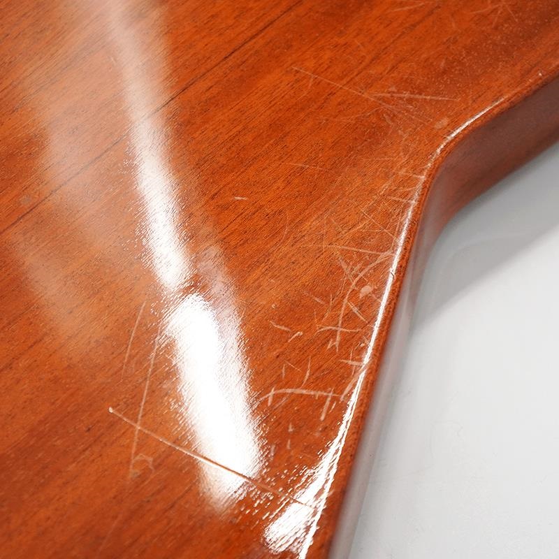 「稲妻」に例えられた大柄で鮮烈なボディシェイプは、1958年の登場より数々のギタリスト達に衝撃を与えましたが、その斬新なデザインは当時の市場に受け入れられずに生産終了となります。その後、70年代に入ると他メーカーによるコピーモデルが人気を集めるようになり、本家Gibsonからも1976年にマホガニー材をボディに使用し再販されることとなりました。今回の入荷はその再生産を開始し、本格的な流通の始まった1976年の仕様を踏襲したモデルになります。