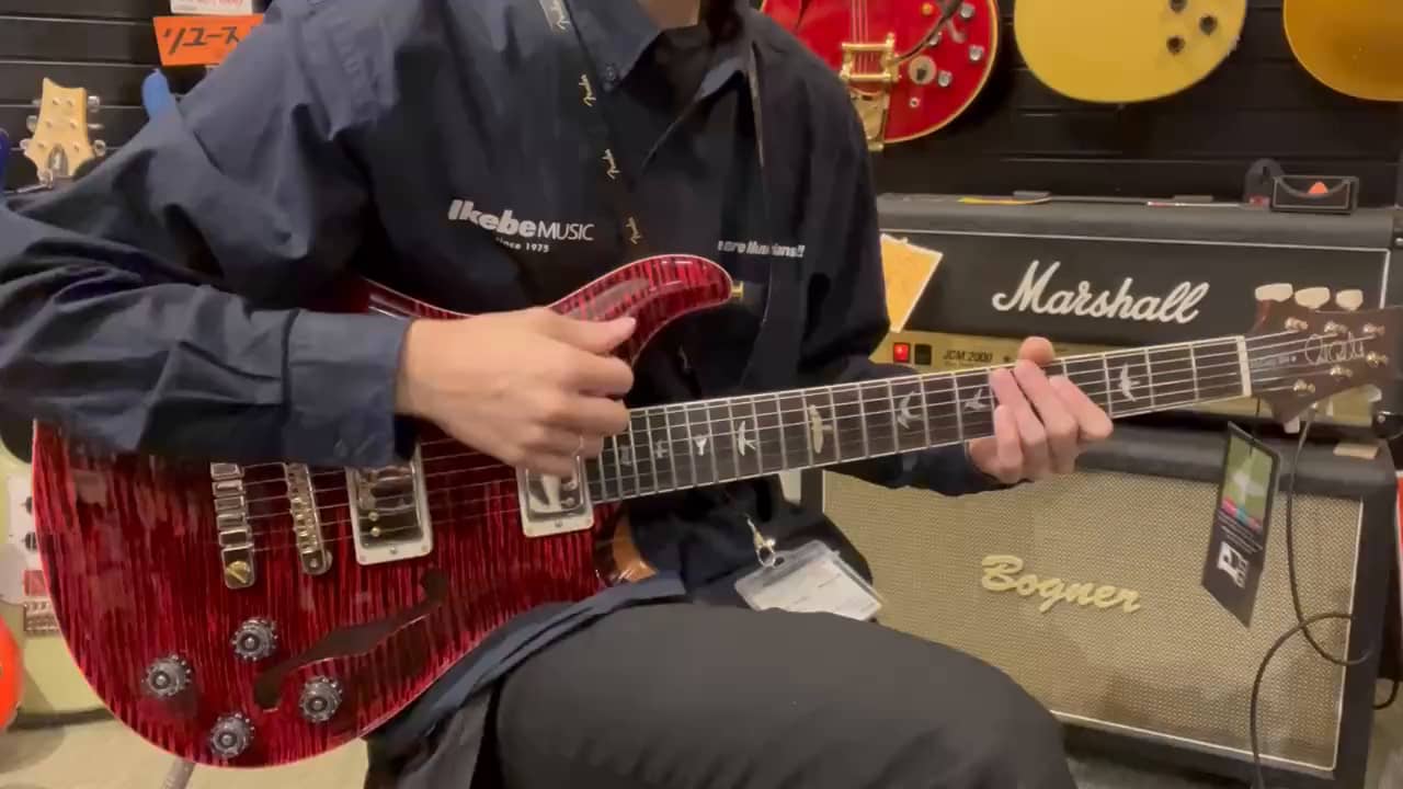 鮮明な赤にゴージャスなトラ目、そして上品さが増すFホール、まとまりつつ気品溢れる1本ですね。見ているだけでまぶしくて癒されて、PRS特有の品のある要素を前面に醸し出した印象です。