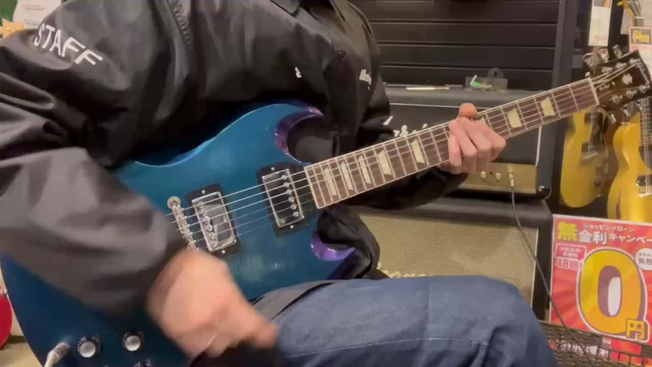 ギブソンナッシュビル2025現地選定品!こんなSGを見たことあるでしょうか!角度によりカラーが変わるGreen/Blue Shiftを採用しており、実際ギターを見てみるとグリーンとブルーに変化するというか、パープルとブルーに変化する印象を持ちます。