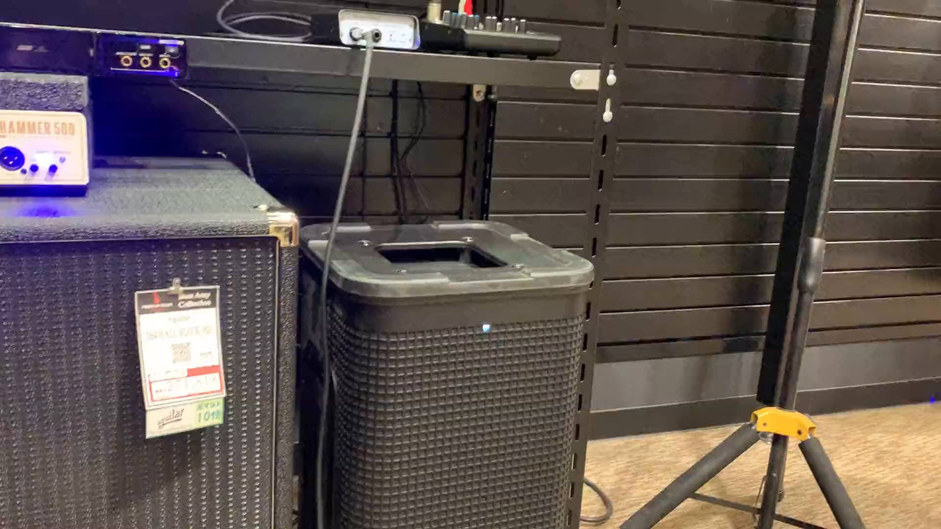 ミキサーは以前も使ってたマッキーですが、モニターは店内イベントで「べしゃりのマイク用」に使ってたLine6のパワードモニターを設置。