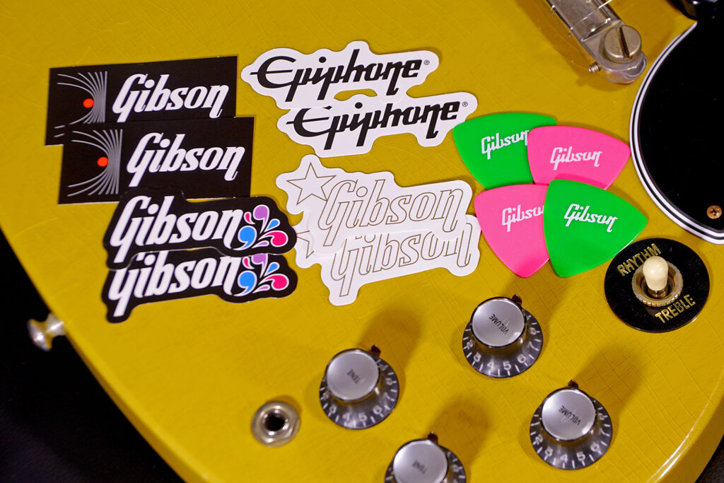 Gibson POP UP Store会場(イケシブ1F)、もしくは下記のエレキギター&アコースティックギター店舗へご来店いただき、スタッフに合言葉を伝えていただいた方に、Gibson ピック&ステッカー 2点セットをプレゼント!