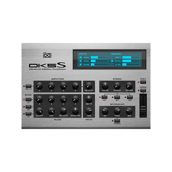 ベースモデルは、加算シンセシスを採用した数少ないデジタルシンセです。PCMと加算シンセシスを融合したシンセサイザーはこのモデルだけです。当時の流行はワークステーション型シンセサイザーで、この国産シンセもご多分にもれず、そのシンセとしての贅沢な品質よりも、ワークステーションとしての機能ばかりに目が向けられていました。DK5Sは、そのデジタルエンジンを深く掘り下げ、非常に強烈なサウンド、歯切れが良く、エッジの効いたリードや濃密なパッド、そし心地よい倍音の揺らぎをお届けします。