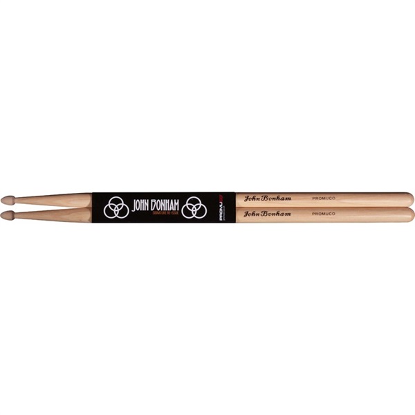 この度発売となったジョン・ボーナム・シグネチュア・ドラムスティックは、プレミアム・ヒッコリー素材を用い、当時のジョン・ボーナム・モデルのサイズとシェイプに合わせて、全長410mm、直径15.0mm、Acornシェイプのチップなど忠実に再現しています。また、ヴィンテージ同様にジョン・ボーナムの名前とプロムコ・ロゴをプリントしています。