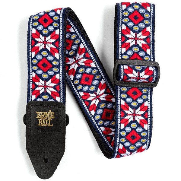 アーニーボールのジャカード・ストラップは、伸びにくく丈夫なポリプロピレンにジャカード織の生地を縫い合わせたストラップです。ポリプロピレンはベストセラー・モデル「POLYPROストラップ」と同じ素材でその耐久性は折り紙つきです。さらに、エンドピンを掛けるストラップ・エンドには丈夫なブラック・レザーを採用しています。