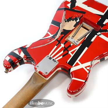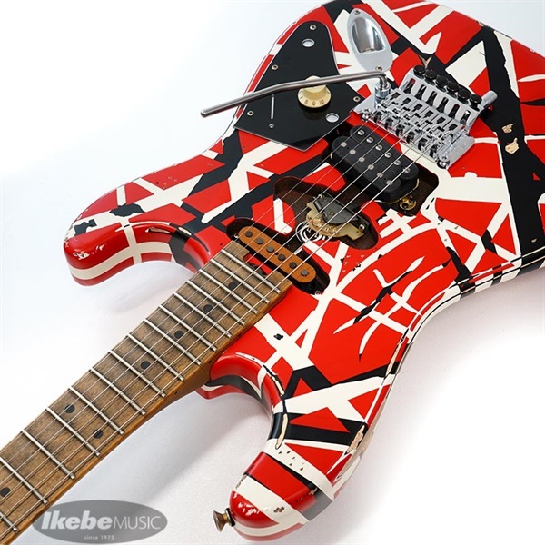 エディの代名詞でもある赤に白と黒のストライプデザイン、そして激しく使い込まれたような擦り切れた外観を持つ本製品は、バスウッドのStratocasterスタイルボディとグラファイトで補強された柾目メイプルネックが特徴です。