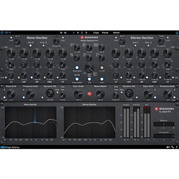 この11バンドEQは、デュアルモノ、ステレオ、M/Sモードで使用可能なフルパラメトリックフィルターを搭載しています。stereo widener、mid/side decoder、先駆的なサミングツール「Mono Maker」、バランスのとれたBass & Presence Shifters、マスタリングワークのための高度なモニタリングとメーター機能を提供します。