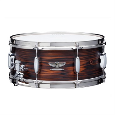 建材や家具、工芸品と幅広い用途で使われる杉材は、軽く柔らかい性質で、サウンド特性としては甘くファットなトーンが特徴です。このモデルでは、杉材を8mm厚の単板シェルに成形し、シェル内面の上下エッジ部分に同じ材を使ったサウンドフォーカスリングを装着することで、単板シェルのもつ優れた振動特性を損なうことなくシェルの剛性を高め、素早い音の立ち上がりを実現しました。シェル外側には、熟練の職人の手による「焼き」加工と日本の伝統的な木工技術である「浮造り(うずくり)]加工を施すことで、杢目が浮き出た立体的で美しい外観に仕上げました。また、フープにはエッジ部分を少し削り落としたカスタマイズドブラスマイティーフープを採用。オープンなサウンドと鋭いアタックをもたらします。スナッピーにはStarclassicベルブラススナッピーを採用し、単板シェルの反応の良さと相まって、プレイヤーの細かいパッセージも逃さない繊細さと豊かな表現を可能にしています。