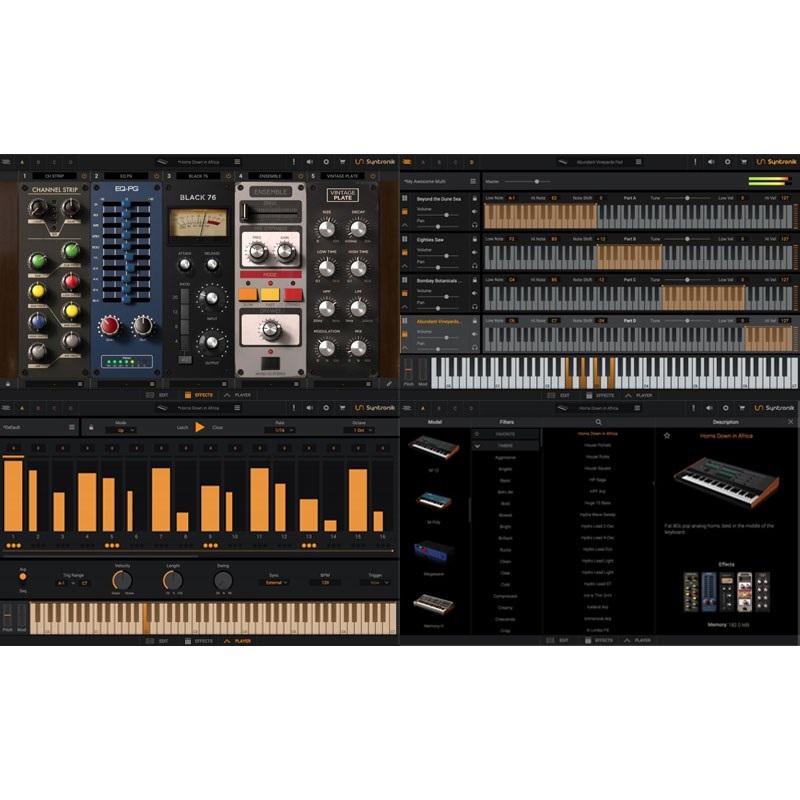 Syntronik 2には、Vintage Plateなど新たに加わった33種のエフェクトを含め、ミックス/マスタリング・プラグインT-RackS 5、MixBox、ギター/ベース・エフェクト・アンプ・プラグインAmpliTube 5譲りのエフェクター・モデルが71種類用意されています。インターフェースにはランチボックス・スタイルの縦型モジュールが採用され、5つまで同時使用可能なスロットが実装されています。クリエイティブなモジュレーション・エフェクトも多いので、モジュラーをパッチするようにサウンド・デザインをお楽しみいただけます。