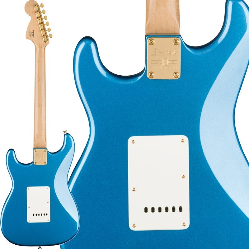 印象的なゴールドのハードウェア、アノダイズド加工されたアルミピックガード、パーロイドのブロックインレイがあしらわれ、バインディングが施されたインディアンローレル指板や、Anniversary仕様の刻印がされたフロントプレートとグロス仕上げが特徴的なこのストラトキャスターは、ステージ上で一層の輝きを放ちます。