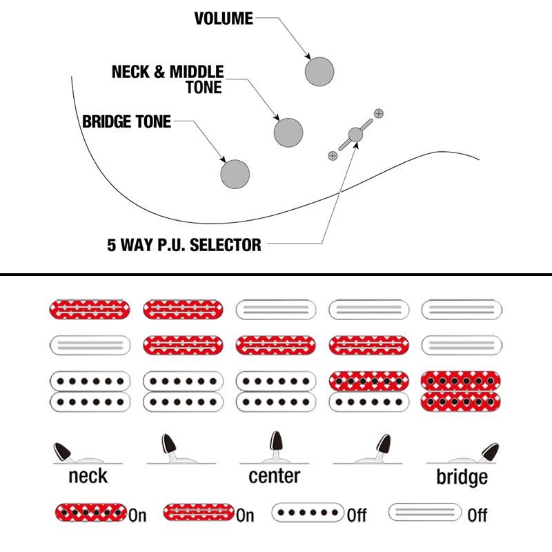 DiMarzio The Cruiserをネックとミドル・ポジションに、シグネチャー・ピックアップであるDiMarzio AT-1(TM)をブリッジ・ポジションに搭載しています。