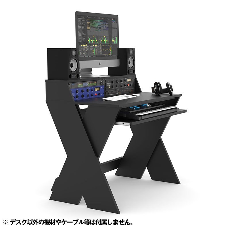 ・ラップトップ/コンピューター、スクリーン、スタジオモニター、オーディオインターフェイス、19インチラックマウント機器、MIDIコントローラー、シンセサイザー、マスターキーボードを設置可能