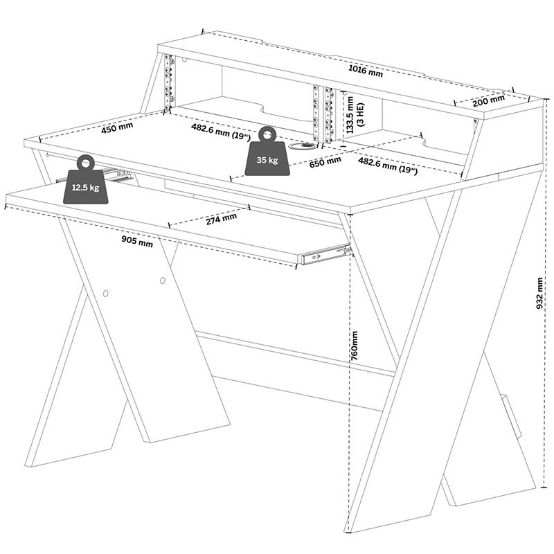 巧みに設計されたスタジオ・ワークステーションは、耳の高さにスタジオ・モニターを、目の高さにスクリーンを設置できるスペースを確保しています。真下の2つの3Uラックには19インチアウトボード機器を収納するスペースがあり、クリエイティブな作業を妨げるものはありません。