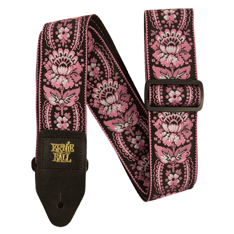 アーニーボールのジャカード・ストラップは、伸びにくく丈夫なポリプロピレンにジャカード織の生地を縫い合わせたストラップです。ポリプロピレンはベストセラー・モデル「POLYPROストラップ」と同じ素材でその耐久性は折り紙つきです。さらに、エンドピンを掛けるストラップ・エンドには丈夫なブラック・レザーを採用しています。