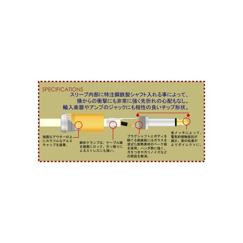 低ノイズでオープンなサウンドを実現する高級OFC銅芯線を採用したケーブルと、カラフルなアルミパーツを装着した高い耐久性を誇るオリジナルプラグを組み合わせ、「音」とファッション」を融合した新しいコンセプトの国産ハイブリッド・ケーブル。
