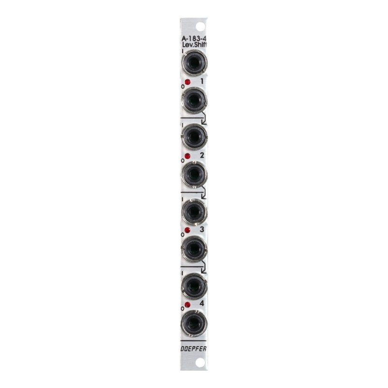 A-183-4 Level Shifter は4基のレベルシフターを搭載したモジュールです。レベルシフターはデジタル・コントロール信号のレベルを増減させる必要がある場合に必要です。典型的な使用方法は +5V 電圧レベル(または+3Vを超えるレベル)のゲート、トリガー、またはクロック信号を +12V 電圧レベルに変換することです。出力電圧レベルはモジュール背面のジャンパーで +12V または +5V に設定できます。工場出荷時は +12V に設定されています。高い電圧レベルから低い電圧レベル(+12V から +5V)に変換することも可能ですが、このように使用することはほとんどありません。ジャンパーによる出力レベルの設定はグローバルで、4基のユニットすべてに有効です。ユニットごとに個別に設定することはできません。4つの出力信号は LED で表示されます。