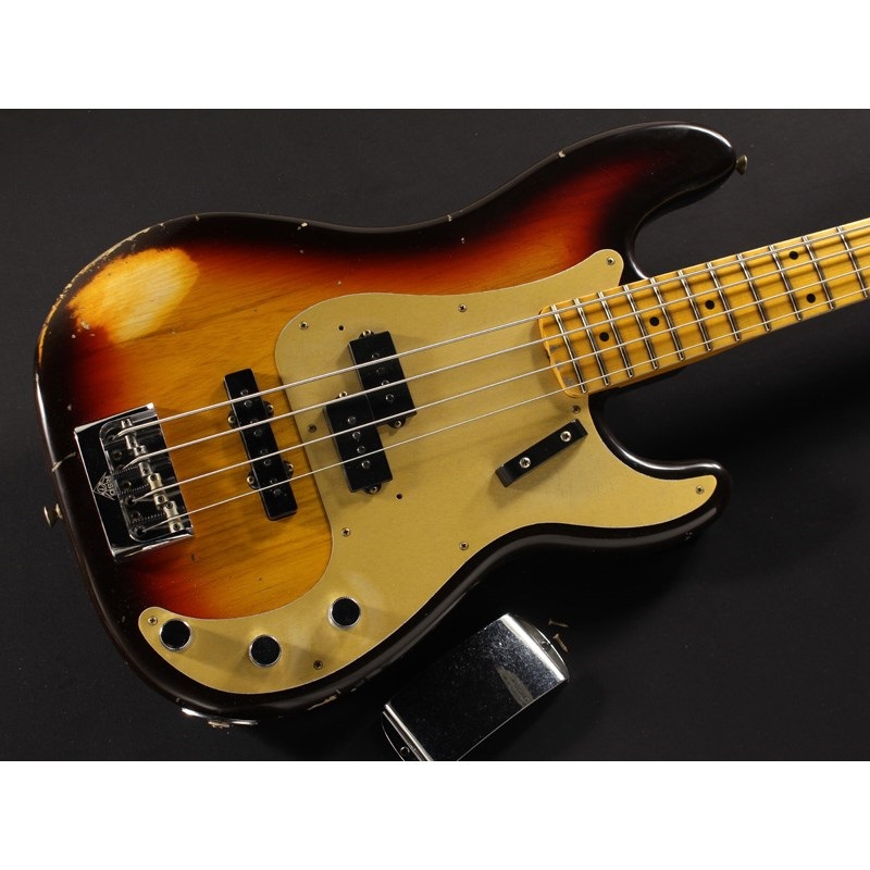 本機は軽量アッシュボディ、ゴールドアノダイズド・ピックガードを採用する50's仕様のP-BassボディにJazz Bassスペックの貼りメイプルネックを採用、P-Jレイアウト仕様で製作されるプレシジョンスペシャルです。塗装仕上げはレリックが採用されており、歴戦の風格漂う雰囲気を醸し出します。プロファイリングされた60's U シェイプの貼りメイプルJネックは、ネックバックの塗装を大胆に剥がしたオイルコートの滑らかな演奏性も相まって、プレベネックが苦手な方にも魅力的な仕上がりでしょう。(※なお、本機ではヘッドデカールもJazzBassのものが使用されています。)トラディショナルな7.25Rの指板に近年主流の6150ミディアムジャンボ・フレット仕様が採用され、演奏性の良さを更に追求。ブリッジには裏通し可能なRSD(Reseach Special Design)デザインのハイ・マス(高質量)ブリッジを搭載。クラシックフィーリング溢れる外観&サウンド路線と、現代ベースに求められるパワー&プレイフィールを上手く融合させた仕上がりとなっています。