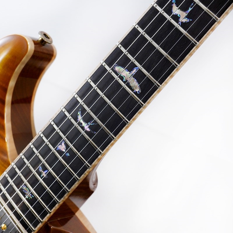 Hardware : Smoked Black / Gold PRS 2pc stoptail bridge, PRS Phase III setscrew locking tuning pegs with Brazikian buttons, a Brazilian Rosewood truss rod cover with Paua purfling, as well as bone nut