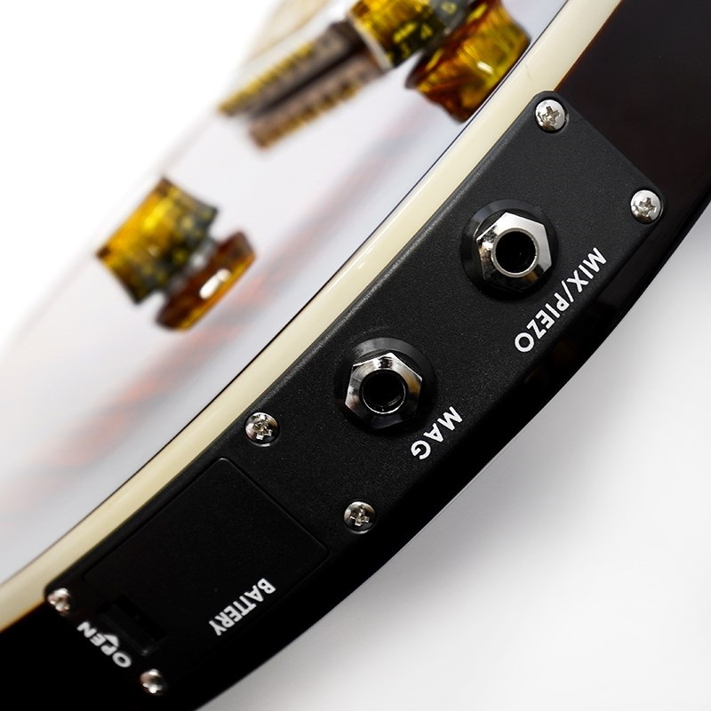 そして、マグネティック・ピックアップ(以下「マグネティックPU」と称する)とピエゾ・ピックアップ (以下「ピエゾPU」と称する)の独立したヴォリューム・ノブと出力ジャック(ミックス/ピエゾ、マグネティック)が搭載されています。