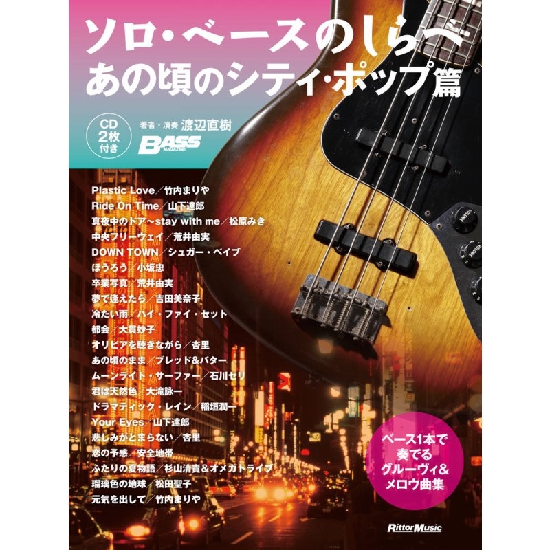 竹内まりや「Plastic Love」、山下達郎「Ride On Time」、大貫妙子「都会」などの名曲を筆頭に全21曲を収録。また模範演奏を収録したCDは2枚組を付録する大ボリュームの内容となっています。これまではクラシックを主とした選曲でバラード調のアレンジを行なうことが多かった『ソロ・ベースのしらべ』ですが、今回はシティ・ポップらしく緩急のついたグルーヴィなアレンジの曲も用意し、これまでのシリーズにはなかったスタイルにも挑戦しています。