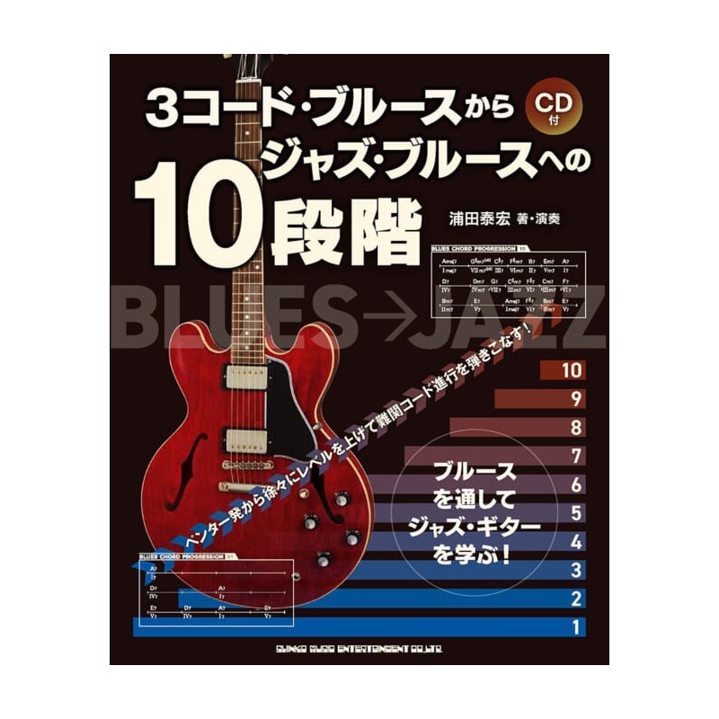 シンプルな3コード・ブルースならペンタでアドリブも楽勝! でも細分化されたコードや部分転調などが盛り込まれたジャズ・ブルース(ビバップ・スタイル)となると、なかなか上手く弾けない…そんなギタリストに贈る、ジャズ・ブルースが段階的にマスターできる教則本です。内容は、レベルが10段階に分けてあるためゲームをクリアしていくように1つ1つ攻略していくことで、徐々にジャズ的なアドリブ・ノウハウが学べるという仕組みになっています。ブルース特有のフレージングの習得はもちろん、レベルが変わることでコード進行がどのように変化していくのか、また各コードで使用できるスケールは何なのかといったことを、練習フレーズと実践プラクティスを通して習得できるのです。10段階すべてのフレーズはすべて、ロックやトラディショナルなブルースに慣れ親しんだ方に馴染み深いKey=Aで用意しました。