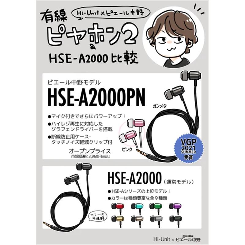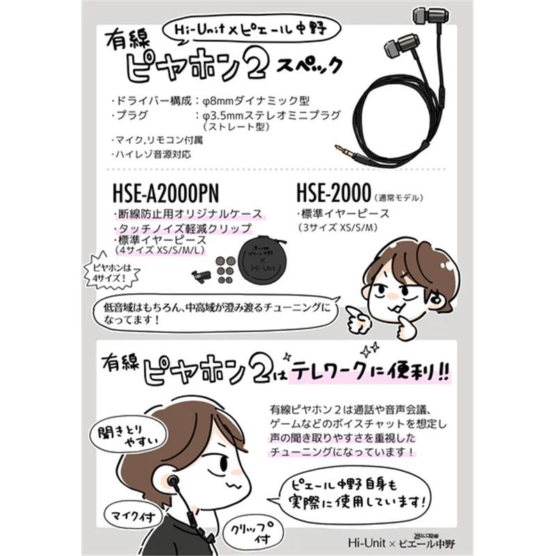 ロックバンド「凛として時雨」のドラマーであり、ポータブルオーディオにも造詣が深いピエール中野氏が、2018年に発売されたHi-Unit「HSE-A2000」(参考売価:税込2,445円)をチューニングした有線ピヤホン第2弾モデル。グラフェンコート振動板を採用したφ8mmダイナミック型ドライバーや、アルミ削り出しのハウジングを採用。マイクリモコン搭載。