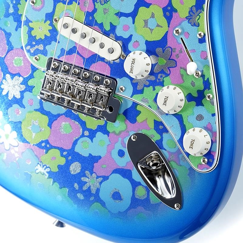 Made in Japan Limited Stratocaster Blue Flowerは、Blue Flowerのシートを貼り付けた、グロスフィニッシュのアルダーボディを採用。21本のヴィンテージスタイルフレットを装備した7.25インチラジアスの1969 Uシェイプメイプルネックが、当時を忠実に再現したクラシカルな演奏製を提供します。また外周のブルーバーストの再調色を行い、より深みのあるヴィンテージルックスに仕上げています。
