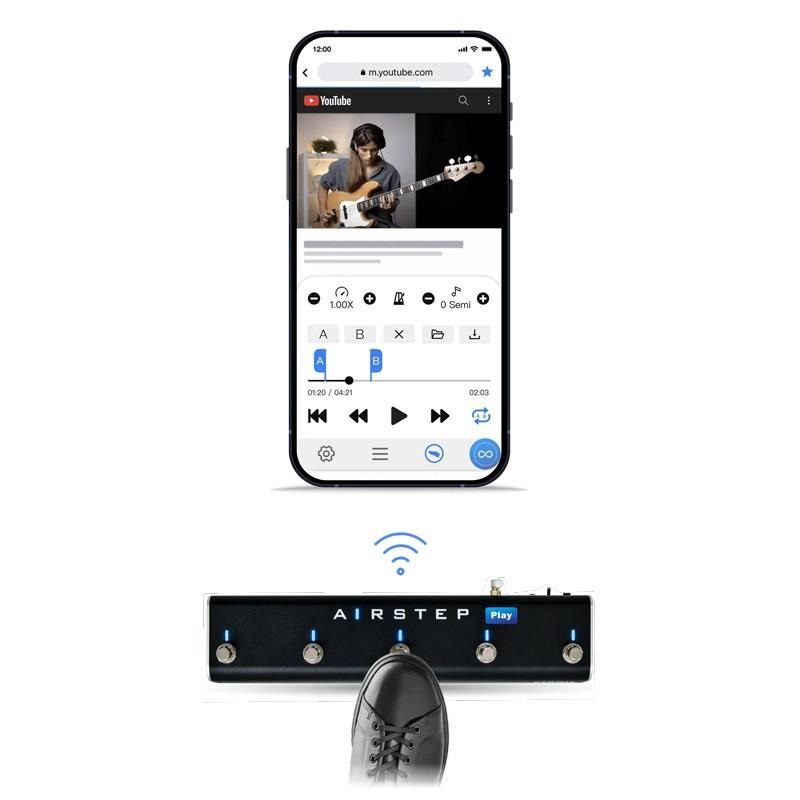 iOSデバイスやAndroidデバイスでは専用のアプリ「AIRSTEP Play」を使って、YouTubeのビデオをロード。再生/停止はもちろん、ループの設定、早送り/巻き戻しを足下で可能にします。1回フットスイッチを踏んだときの早送り/巻き戻しの秒数も設定可能で、複数のペダルを同時に踏むことで異なる秒数で早送り/巻き戻しを行えます。
