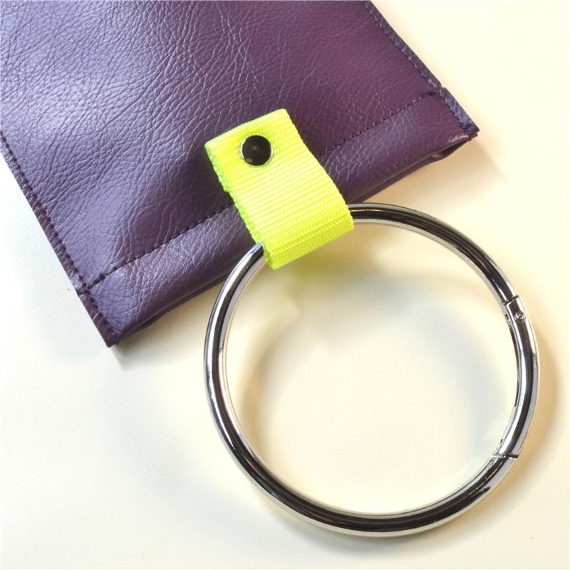 丸いリングに腕を通せばバッグのようにそのままで持ち歩け、カラビナを使えば鞄にかけたりフロアタムにぶら下げることも可能。