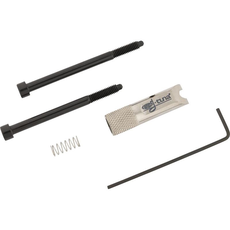取り付け用ハードウェアと、説明書を付属し、取り付け後は「スライドインでE、スライドアウトでD」というシンプルな操作だけで容易にチューニングの切り替えが可能になります。ほとんどのFloyd Roseスタイルのトレモロに、数分で後付け可能です。