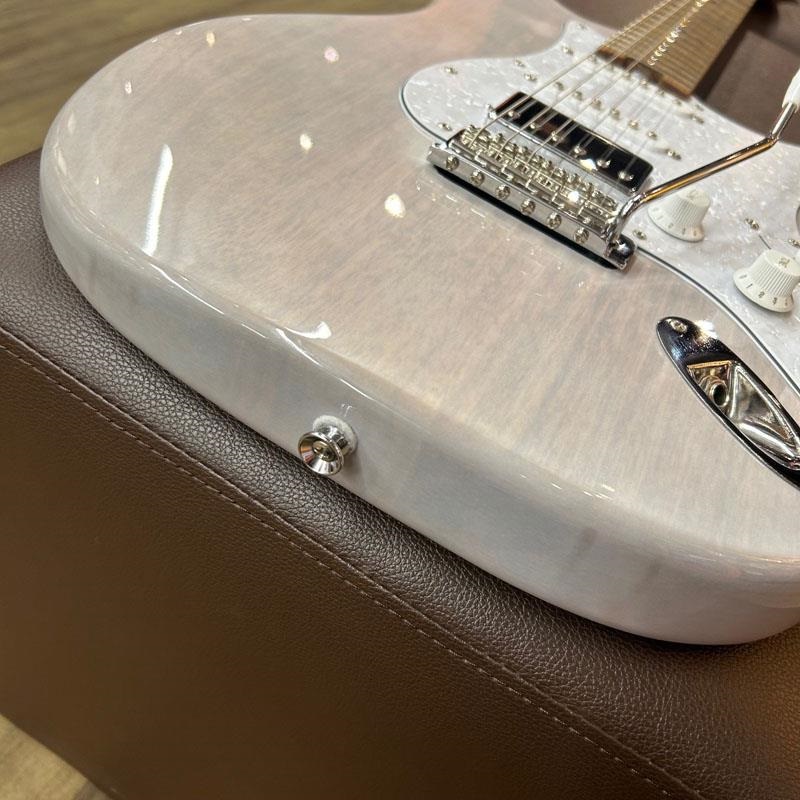 本機はメイプルを高温で加熱処理して材の中の水分や油分を揮発させることにより剛性を高めたローステッドメイプルを使用。その効果は安定性だけでなくサウンドにも及び、豊かな生鳴りと経年変化したビンテージのようなこなれたトーンを生み出します。高級機種で使われることの多いこの本格派仕様をリーズナブルな価格帯に落とし込んだBacchusの新しい製品ラインナップ、ウィルキンソン製のブリッジ、オリジナルのロッキングペグやオリジナルのSSH配列のピックアップにコイルタップ搭載と充実のスペックを持った逸品です。