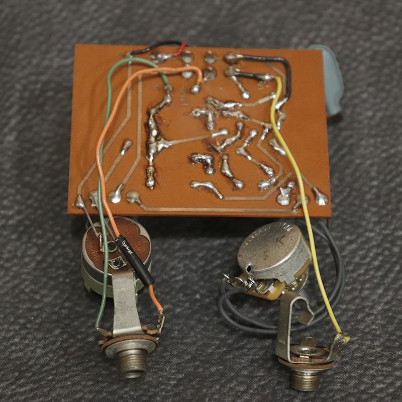コントロールは【電源ON/OFF&ボリューム/ファズ】の2ノブ仕様。トランジスタは交換済みで、少し後年のフェアチャイルド2N4970を2基搭載。その他ファズPOTが交換済みです。アッパー系のギラつく過激なファズが魅力、ボリュームアップ時に本領を発揮する轟音がクセになりますね。