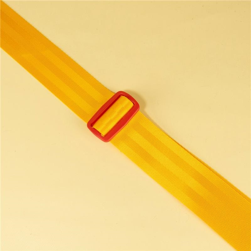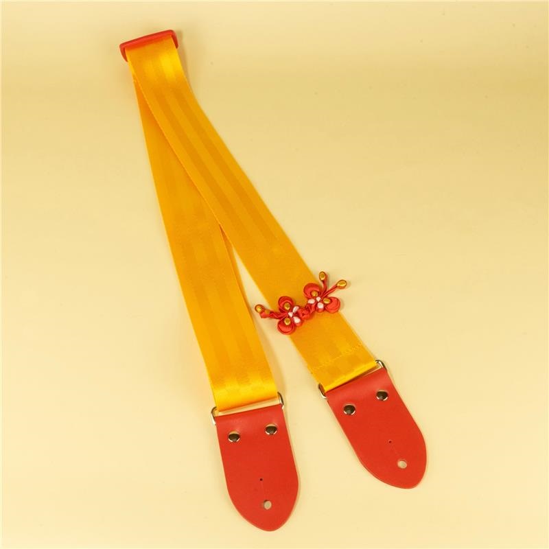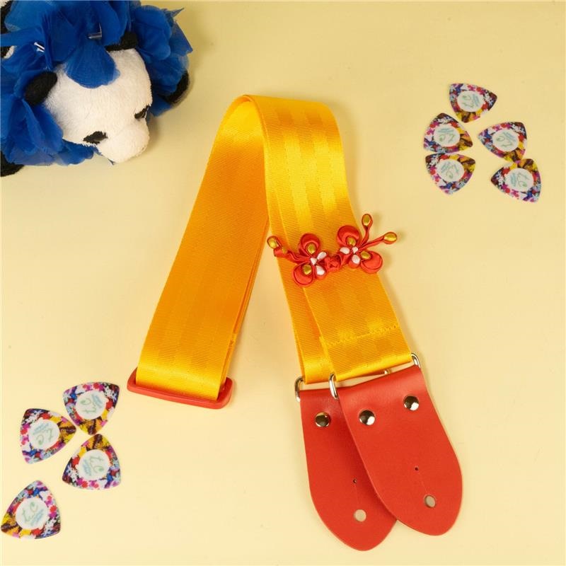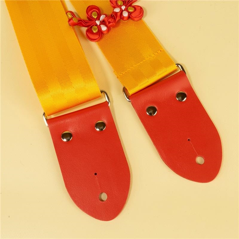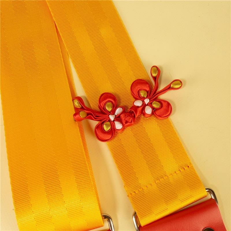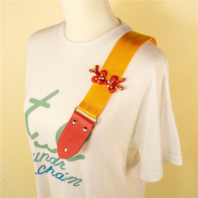 滑らかで肌辺りもよいマスタード色のシートベルト素材と、赤いストラップエンド、同じく赤いプラアジャスターでポップにまとめたギターストラップに、蝶々を模したかわいいチャイナボタンをワンポイントプラスしました。