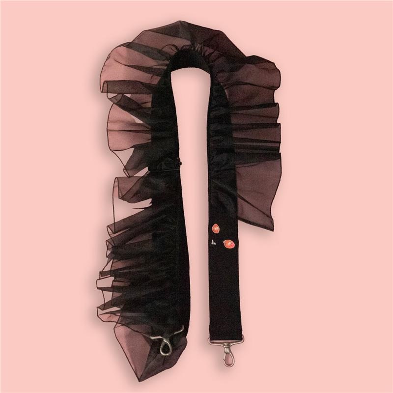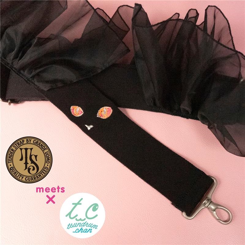 柔らかくて肩馴染みの良いアクリル製のベルトを使用。黒ベルトに映える、シルバー・ネオンピンク・ネオンオレンジのド派手カラーで大人気の猫目を刺繍し、張りのあるゴージャスなフリルを思う存分付けました。