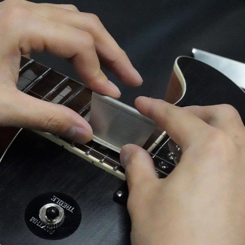 ガタツキがある場合、中央のフレットが高くなっている状態です。ZONEファイルのヤスリ部分を使ってレベリングを行い、ガタツキが無くなったか確認をします。