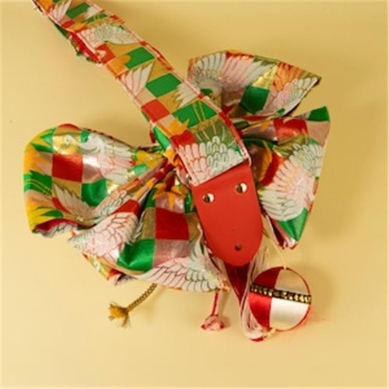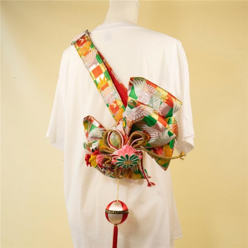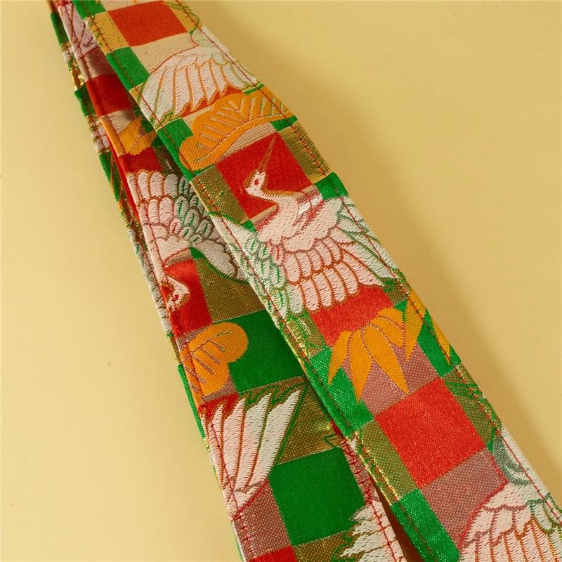 赤・緑・ゴールドの市松模様に縁起の良い鶴が舞う大胆な柄の着物帯を、赤いストラップエンドでおめでたくまとめたデザインは、同じく鶴の帯飾りがより一層華やかな印象にしてくれています。