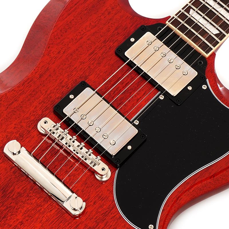 61年スタイルのスモールピックガードがSGファンの心をくすぐる1本。SGの特徴と言えば、薄いソリッド・マホガニー・ダブルカッタウェイ・ボディとスリムテーパーに仕上られたネックシェイプですね。軽量かつハイポジションでもスムーズなフィンガリングが可能となっており、高いプレイアビリティを誇ります。