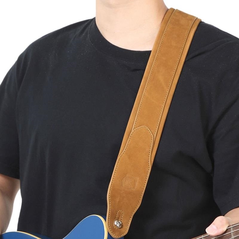 上質なレザーを用いたスエード仕上げのギターストラップです。耐久性に優れながらも使い込むほどに味わいが増し、手に取るたびに愛着が深まります。内側にはしっかりとしたクッション素材を搭載し、肩への負担を軽減。長時間のリハーサルやステージでも快適な装着感を提供します。