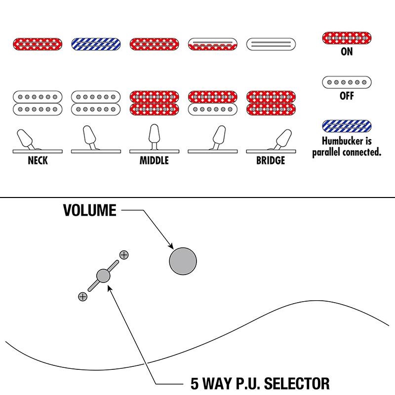 HHピックアップ・レイアウトながら、フロント・パラレル配線や、フロント・タップ+リア・タップ・サウンドも出せる、5WAYスイッチング・システム。