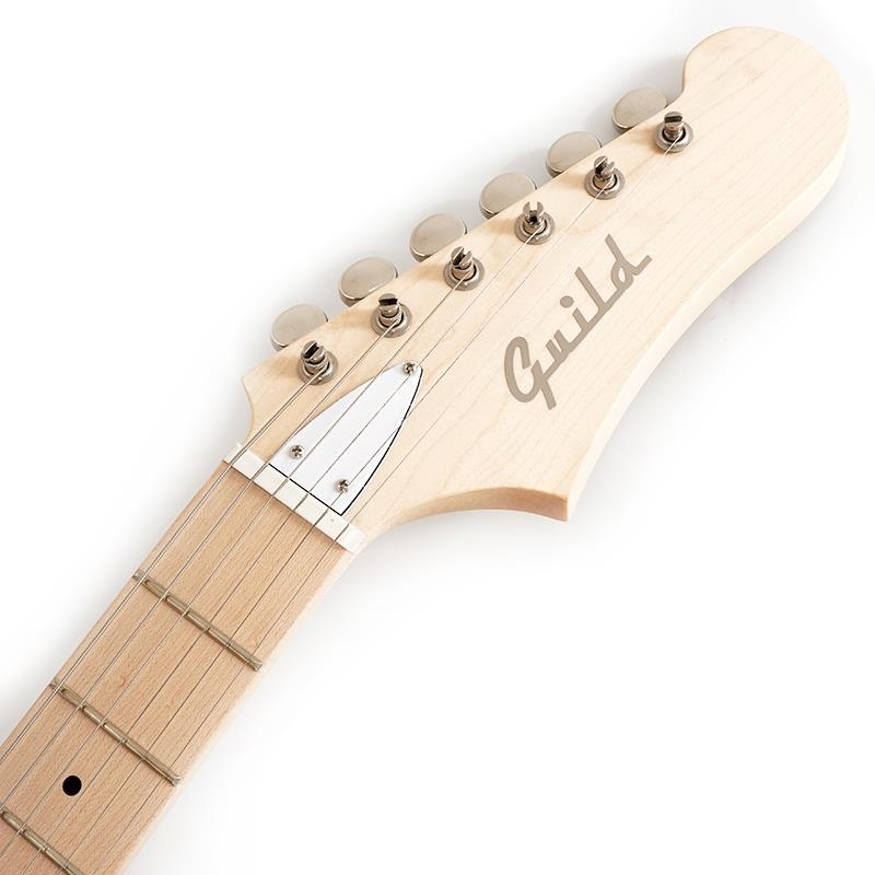 Guildの中でも数少ない25.5インチ・スケールを採用しているエレクトリックギターのモデルの1つで、長めのスケールと3つの優れたピックアップのコンビネーションにより、チャイムのように抜けるリード・トーンから、分厚く重厚感のあるリズム・トーンまで、あらゆるサウンドを提供します。ブリッジ・ポジションに搭載されているGuild LB-1ピックアップからは、ビンテージを彷彿とさせるクラシックなハムバッカーのサウンドが得られ、煌びやかなクリーンから太く温かみのあるドライブサウンドまで実用的なトーンが特長です。また、そこにブレンドされるネック&ミドル・ポジションに搭載された2つの新しいDearmond Aerosonicピックアップは、歯切れの良いシングルコイルのサウンドを実現しています。
