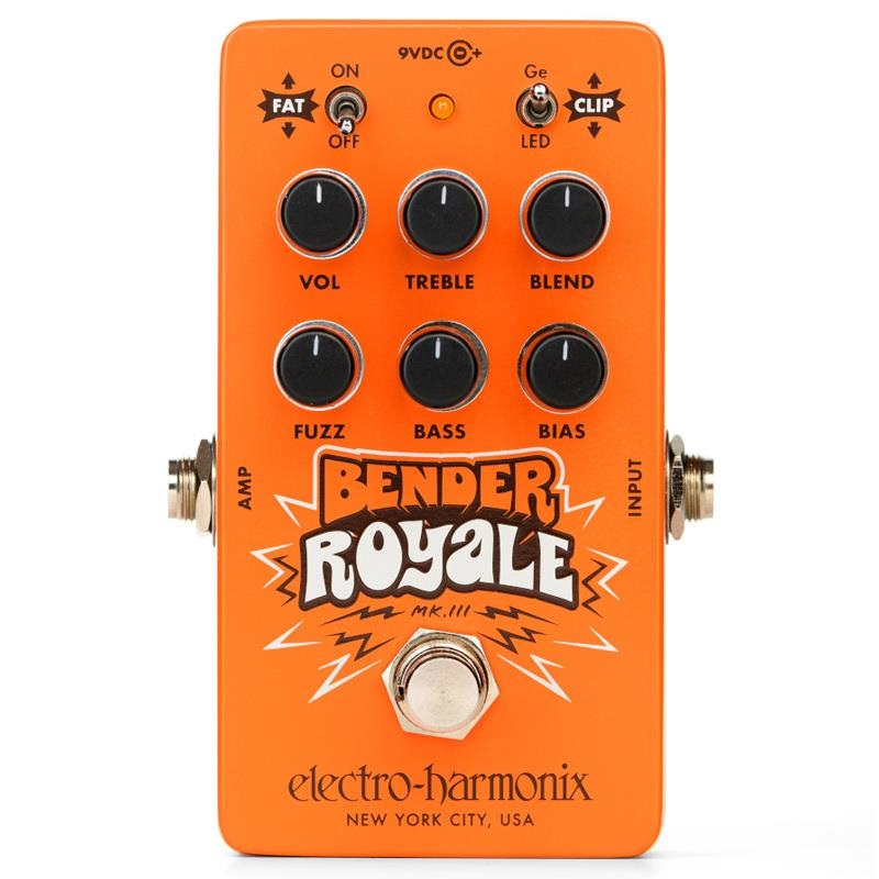 3トランジスタ・ファズの歴史は、多くのメーカーと個性豊かなバリエーションによって築かれてきました。Bender Royale Fuzz は、その系譜に新たな1ページを刻むべく誕生した、EHX渾身のファズペダルです。ヴィンテージのゲルマニウム回路をベースにした MKIII バージョン を採用し、オリジナルの濃厚なキャラクターを継承。分厚くスムーズなファズから荒々しいスパッタリングまで幅広いサウンドメイクが可能です。荒々しく攻撃的なファズが欲しい人も、力強く深みのあるトーンを求める人も、Bender Royale が応えます。オリジナルの3ノブ構成は VOL、FUZZ、BASS として搭載され、出力、ゲイン、低域レスポンスを自在にコントロール。巨大なリズムトーンから鋭いリードまで幅広く対応します。現代的なアップグレードの中心は、低音とロー・ミッドをブーストする FATスイッチ。CLIPスイッチ は最終段トランジスタのクリッピング構造を切り替え、GeからLEDに変更することで荒々しいエッジの効いたトーンを実現。BIASコントロール は回路電圧を調整し、スムーズからスパッタリングまで自在に変化。TREBLE は高域をコントロールし、BLEND でクリーン信号をミックスすれば、アタック感や明瞭さを保ちながら他ペダルやベース使用にも対応します。