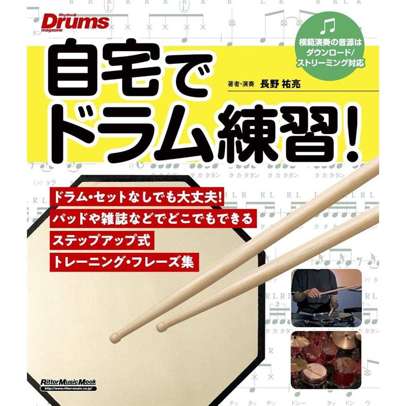本書は、練習パッドや雑誌などでもできるドラム練習フレーズをストリーミングやダウンロード対応の連動音源で聴いて確認しながらトレーニングしていけるドラム教則本です。