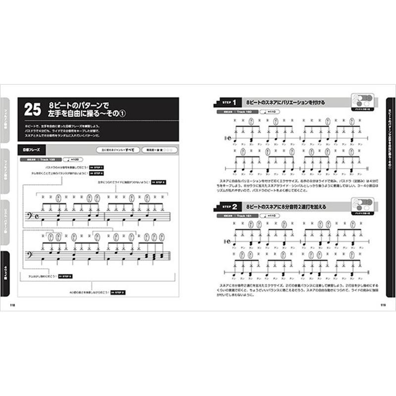 各テーマは4ページ完結なので取り組みやすく、ドラムの技術もグングン上達可能。