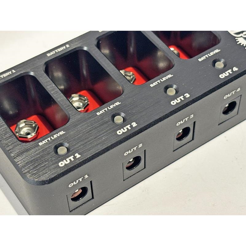 すべての出力は完全に分離されているため、プラスアースとマイナスアースのペダルを並べて使用してもノイズや干渉が発生することはありません。電源管理はシンプルです。「マスターバッテリー」スロットを1つ装備し、超低消費電力のスタンドアロンモードでユニットを動作させるか、外部DC電源を供給してオートモードで完全にバイパスすることもできます。